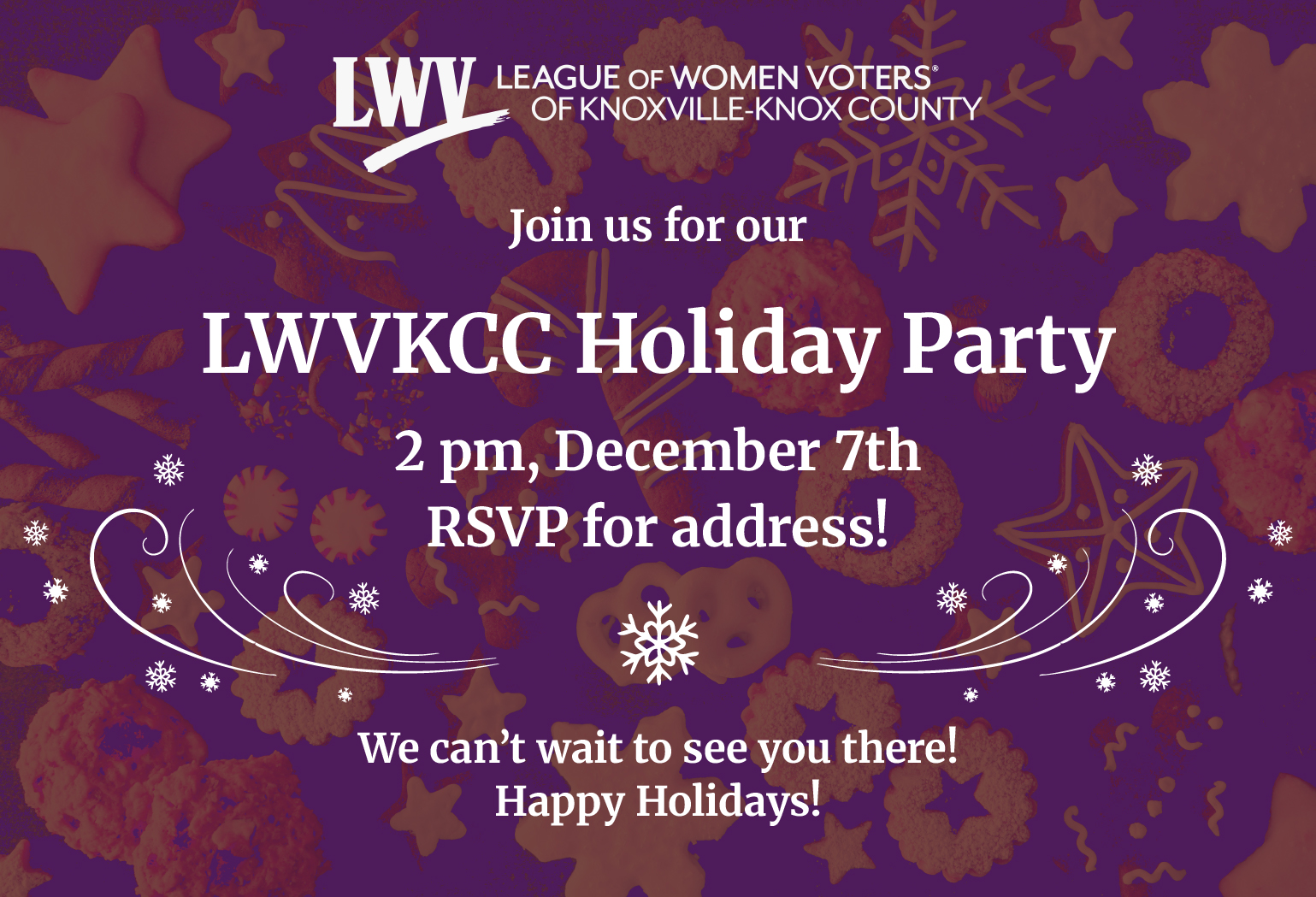 Time to celebrate our friendships made while empowering voters and defending our democracy. Come for a warm, festive social with our members. Bring a snack to share. Drinks will be provided. Drop in at any time. Bring a guest. All are welcome.